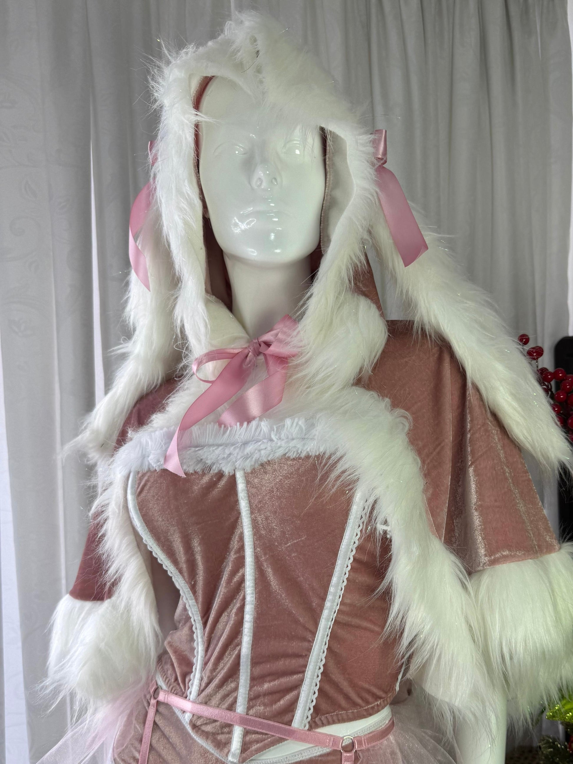 Incluye una capa con orejitas decoradas, corset estructurado que realza la figura, ligero a juego y un cachetero cómodo y coqueto que completa el look.