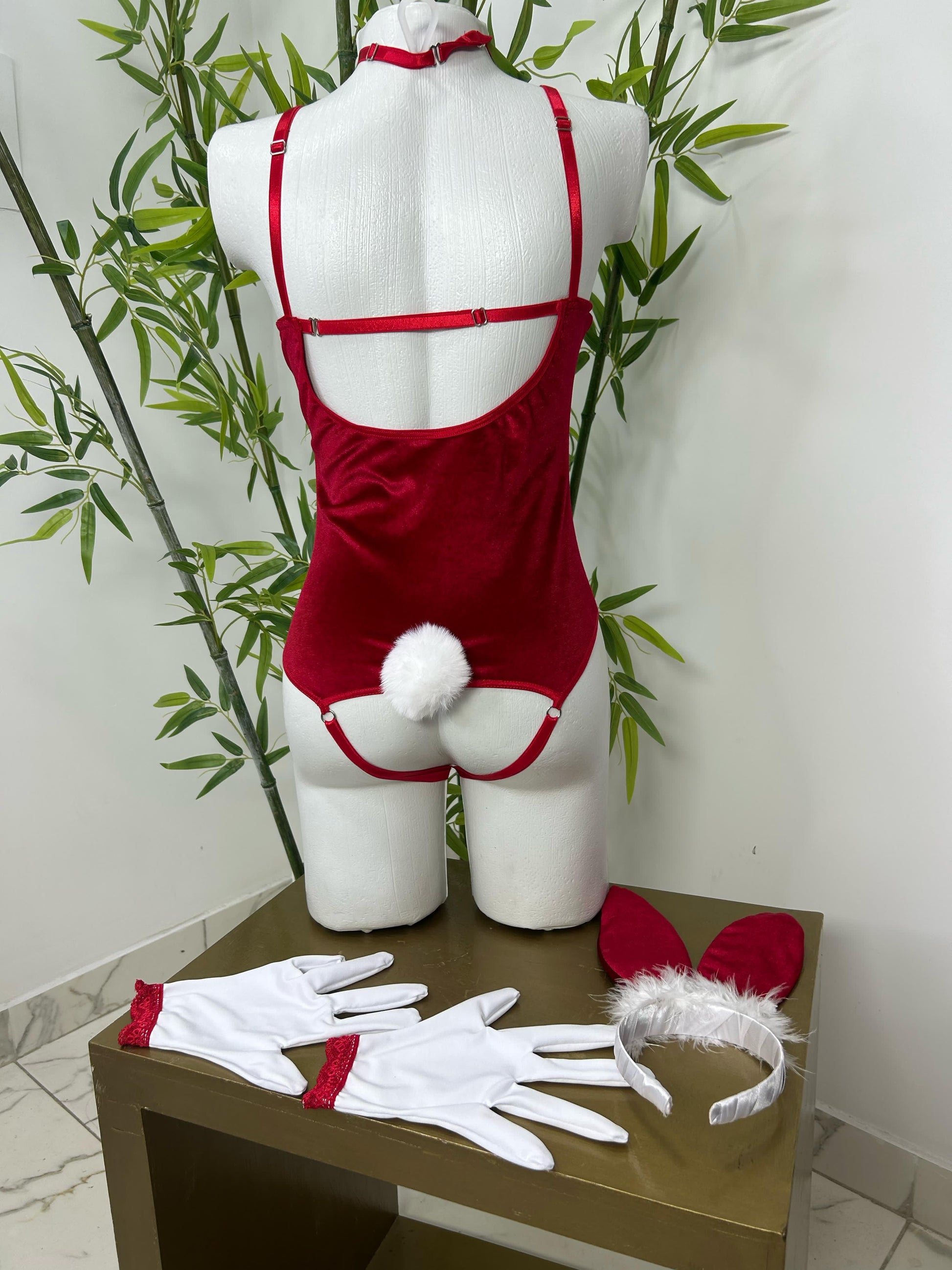 Este hermoso disfraz de conejita Playboy incluye todas las piezas que ves en la imagen, elaborado en un exquisito terciopelo color rojo pasión y detalles sensuales que lo convierten en un disfraz provocador.