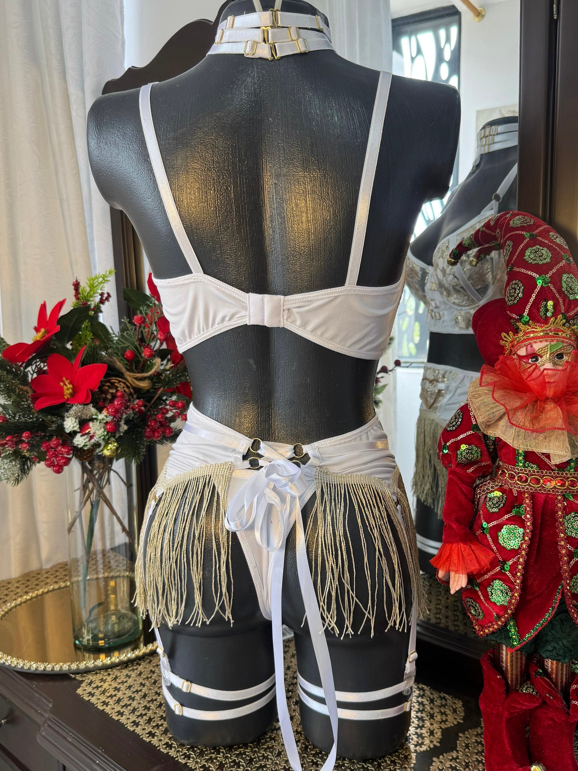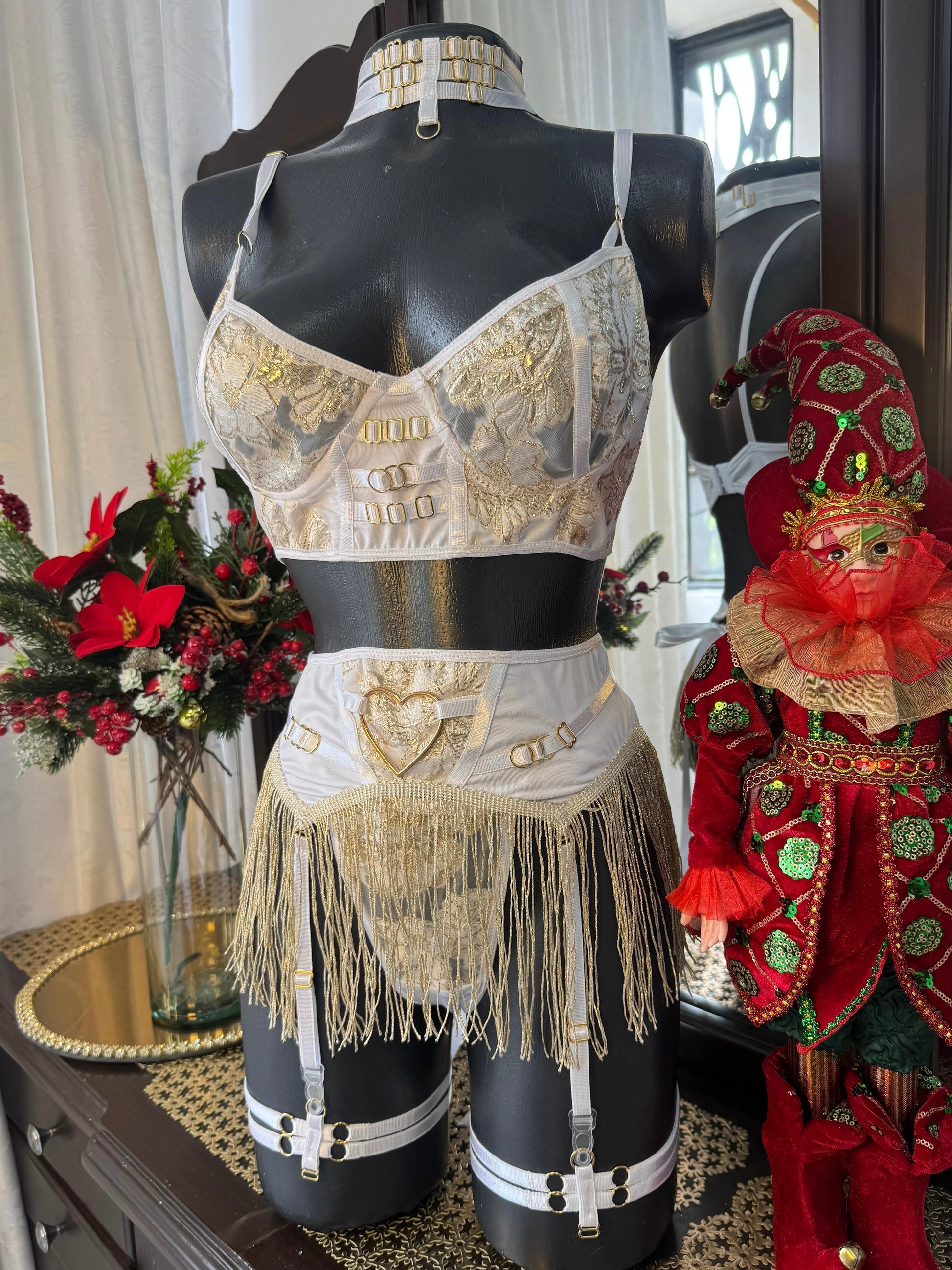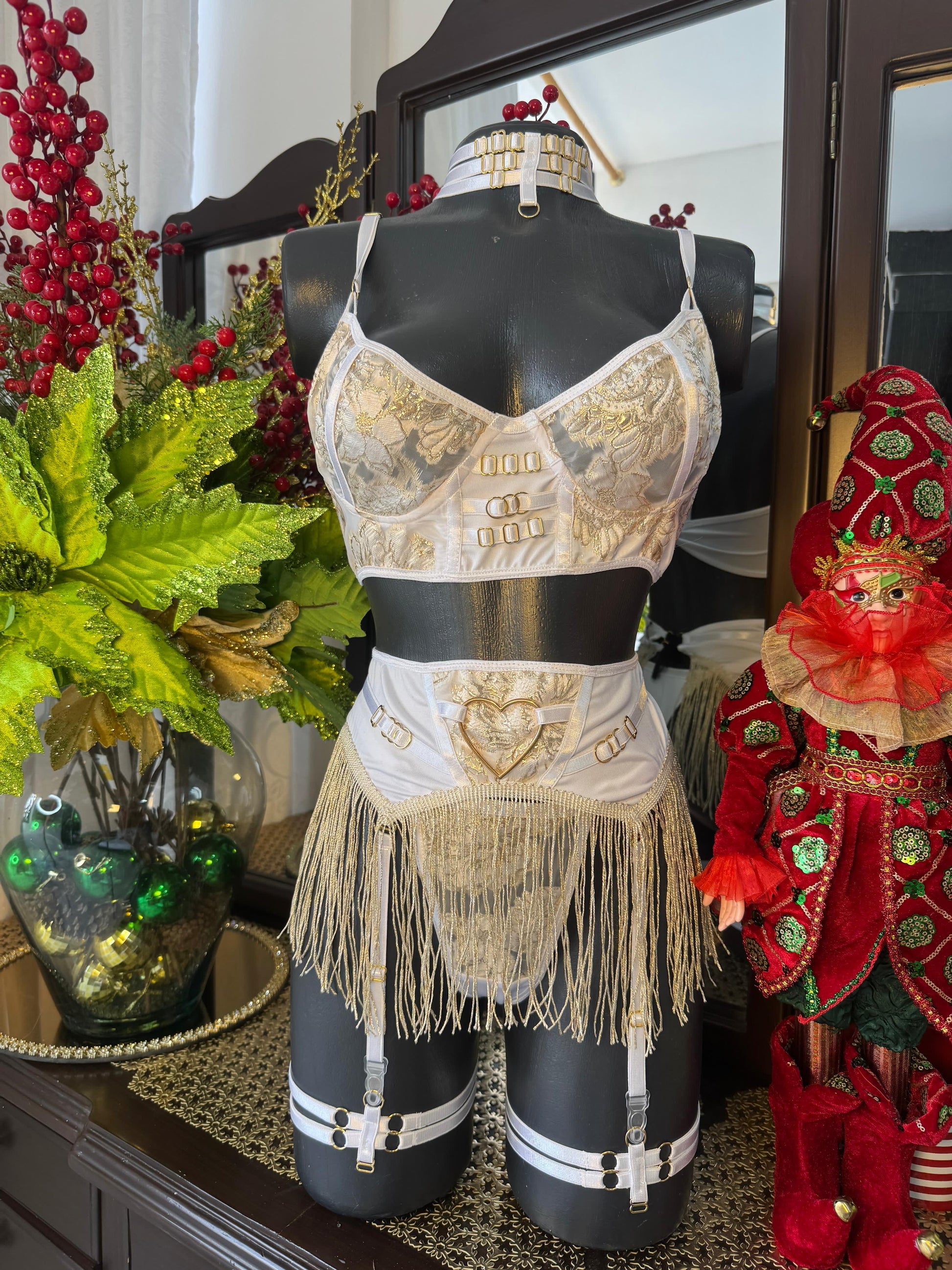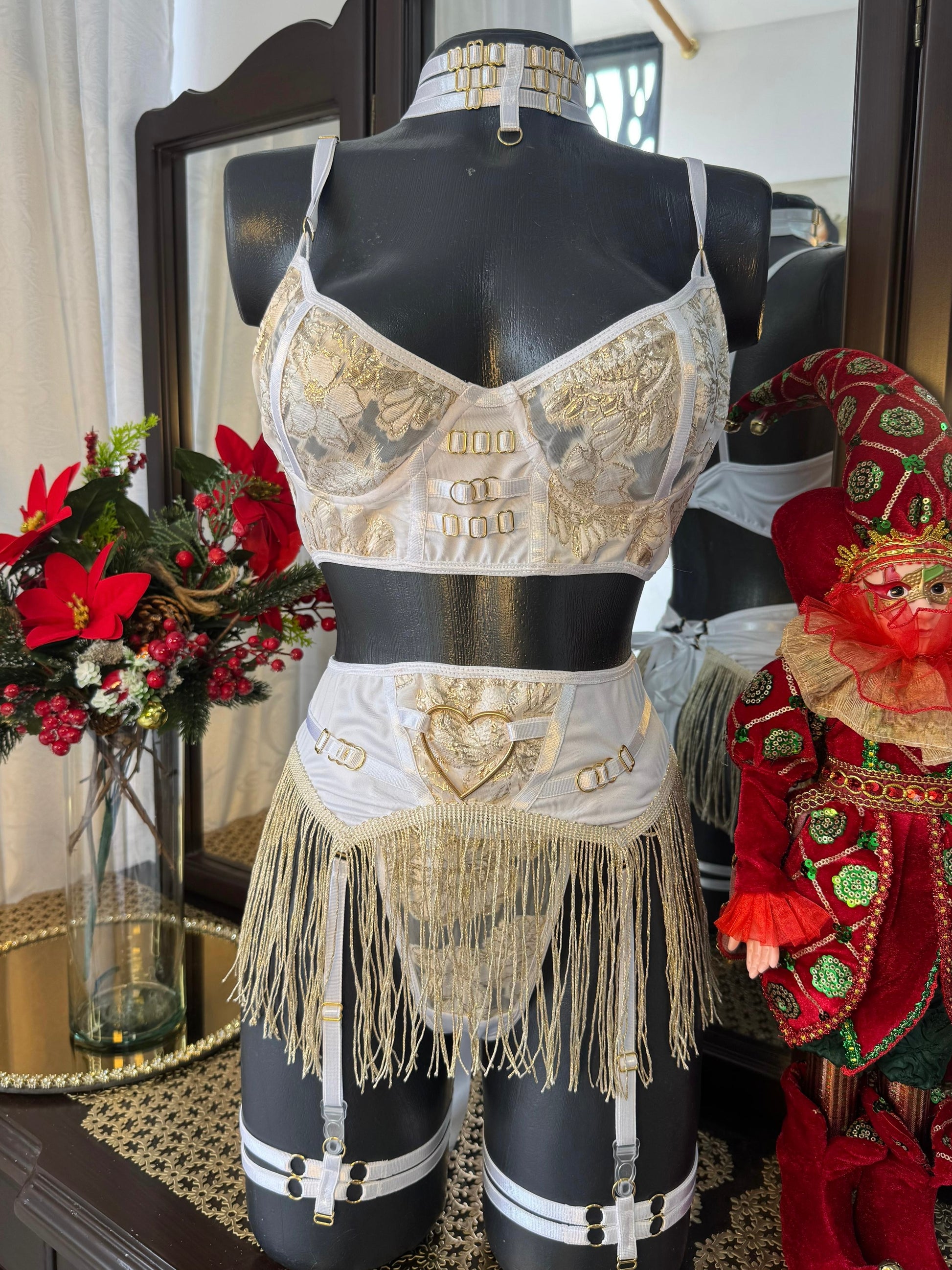 El conjunto incluye brasier bordado, liguero con flecos dorados y panty a juego, todo decorado con aplicaciones sofisticadas que crean un look glamuroso e inolvidable. Las hebillas metálicas y el diseño estructurado aportan un estilo moderno, fuerte y femenino.