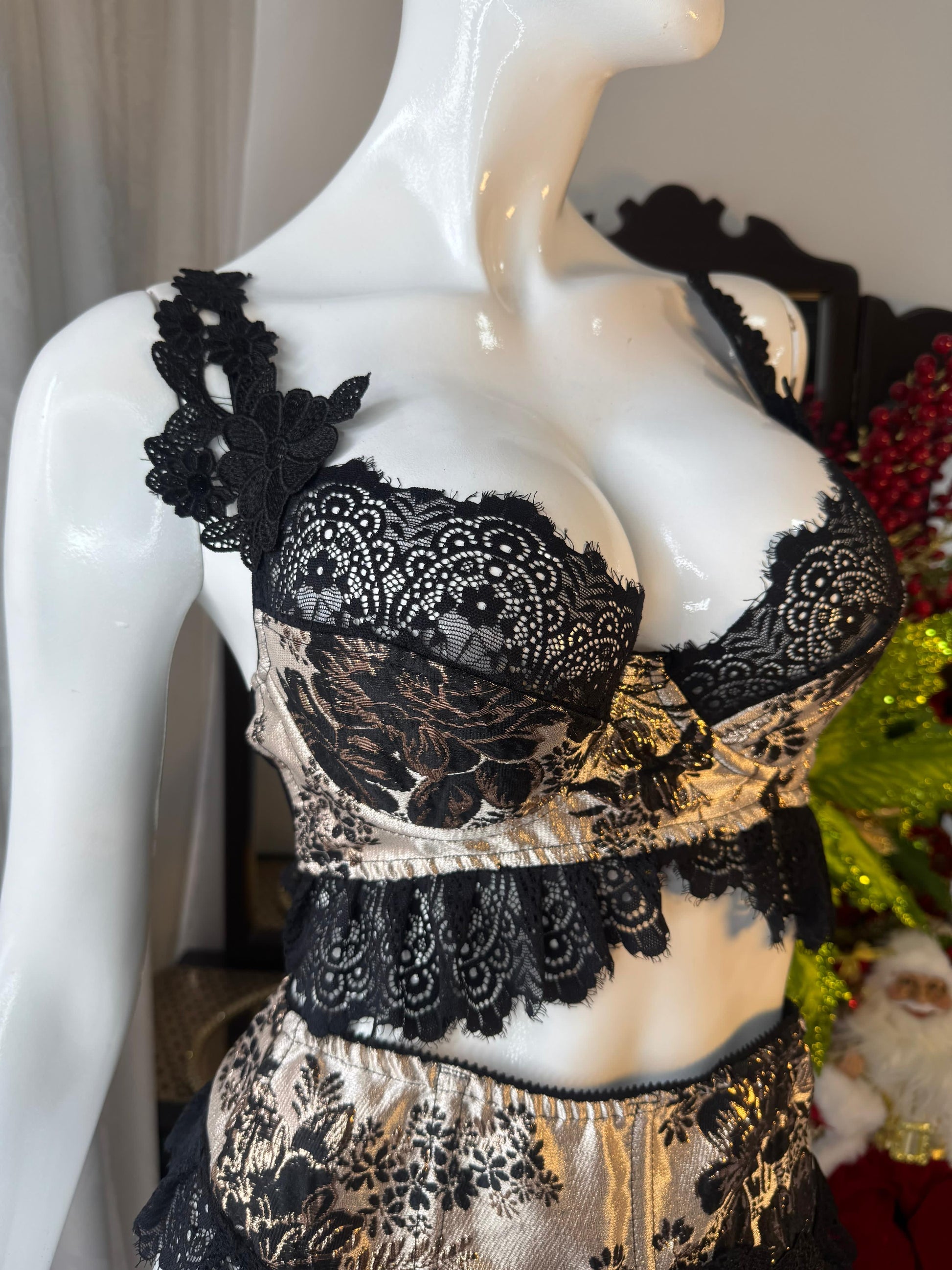 La Lencería Secret combina encaje negro, bordados metálicos y un diseño impecable que realza la figura con sensualidad y sofisticación.