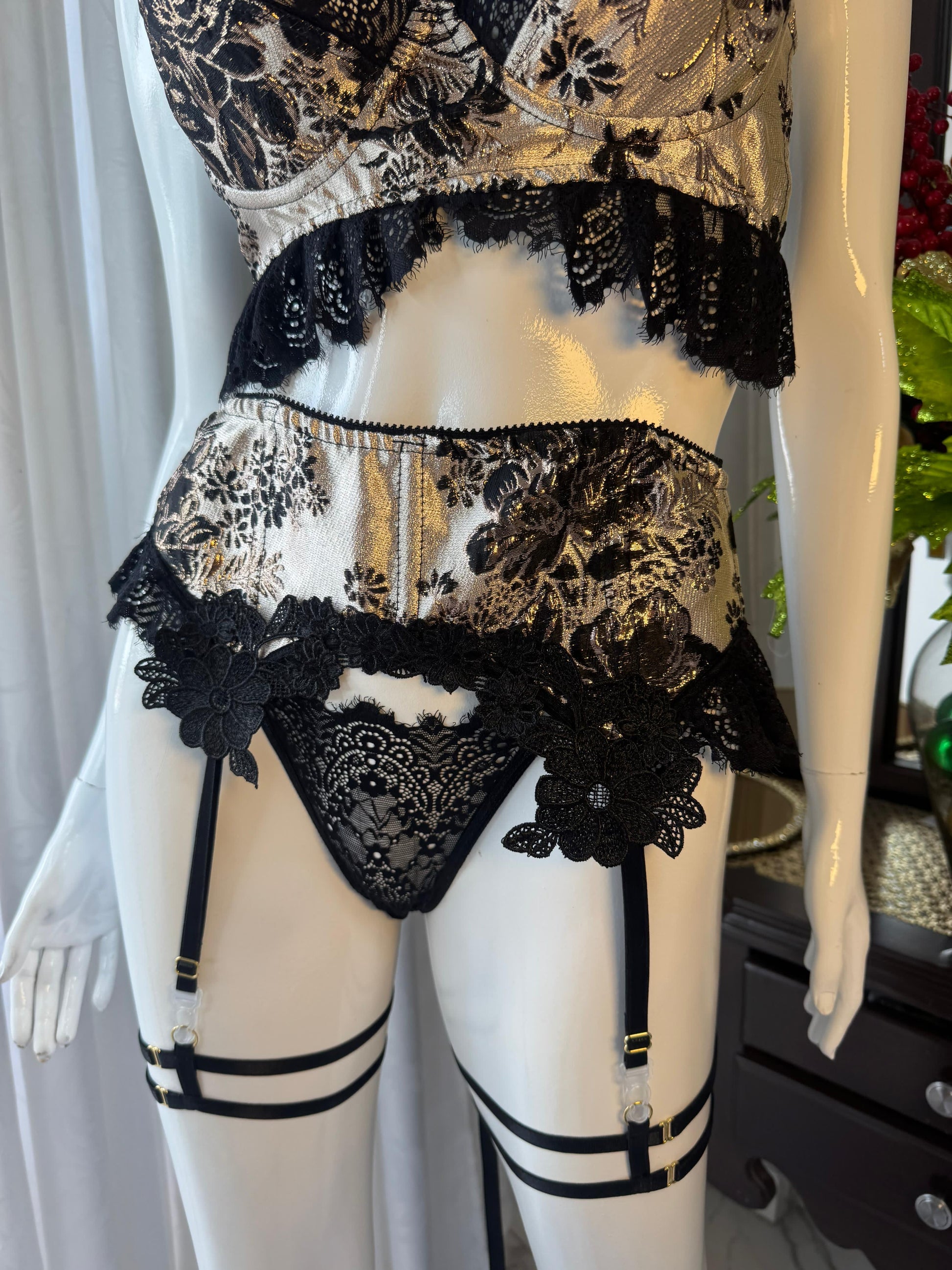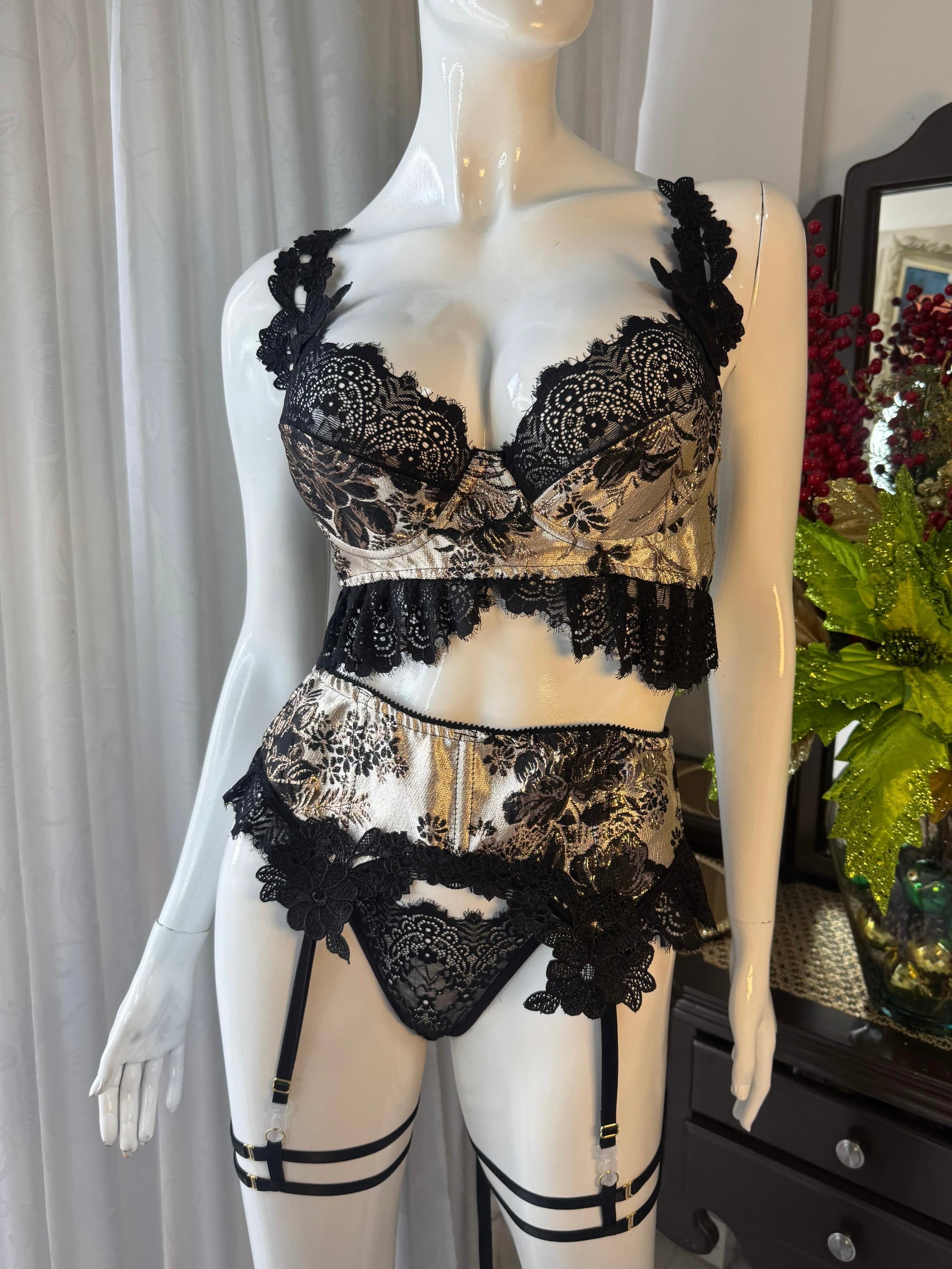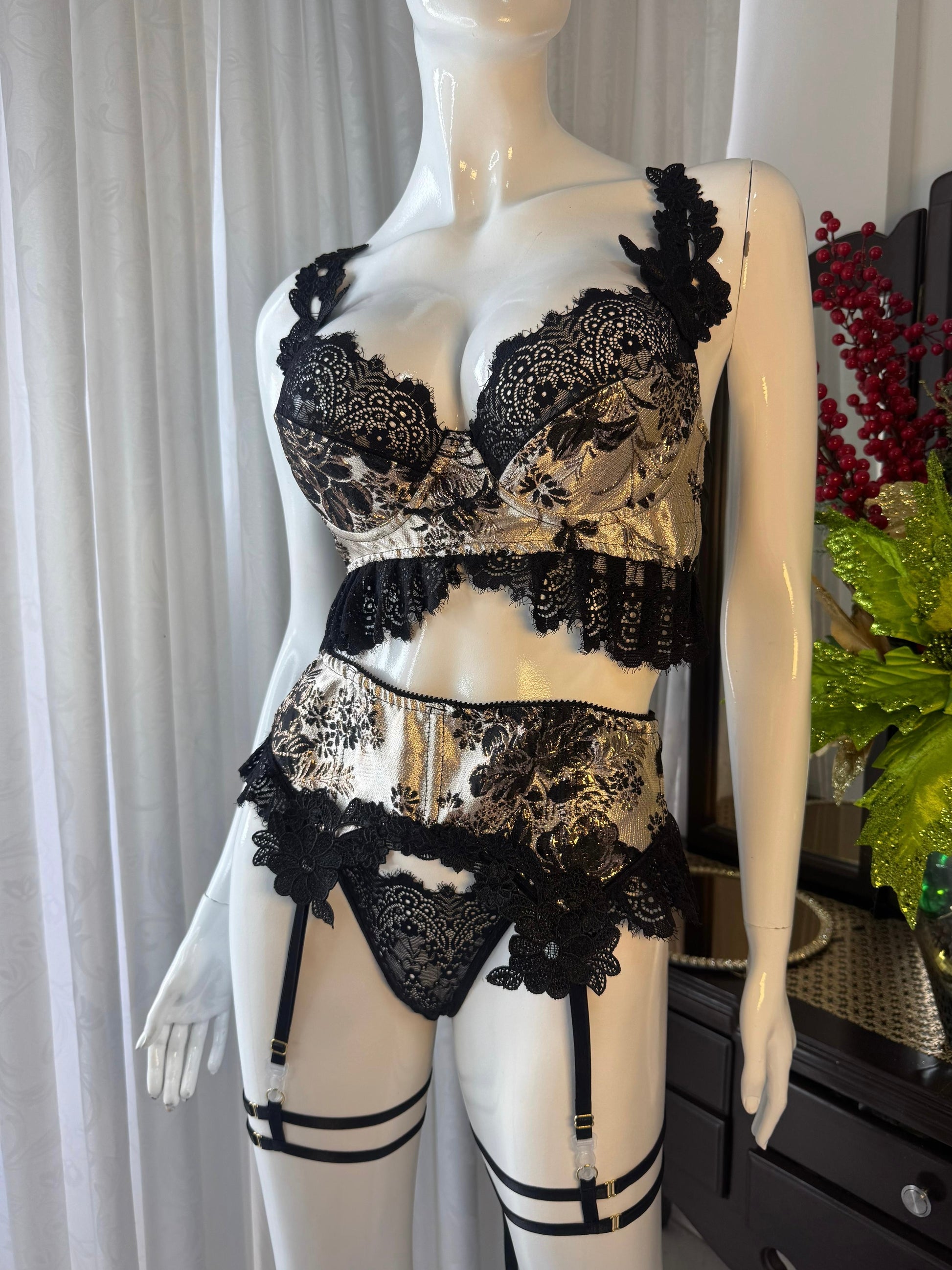 Incluye brasier estructurado, panty en encaje, portaligas y ligeros que aportan un efecto estilizado y muy femenino. El contraste entre el negro profundo y el brillo dorado crea una pieza exclusiva y cautivadora.