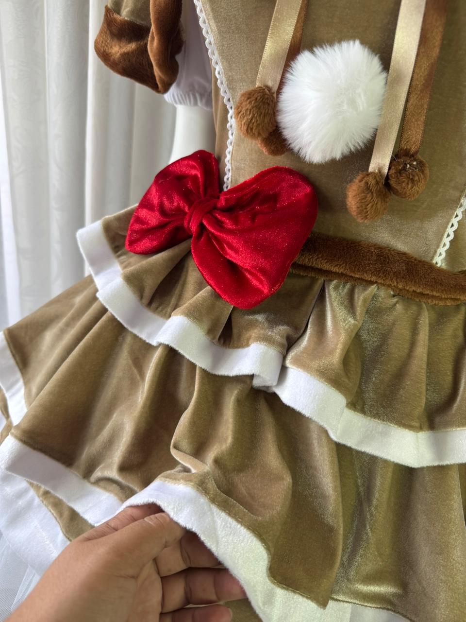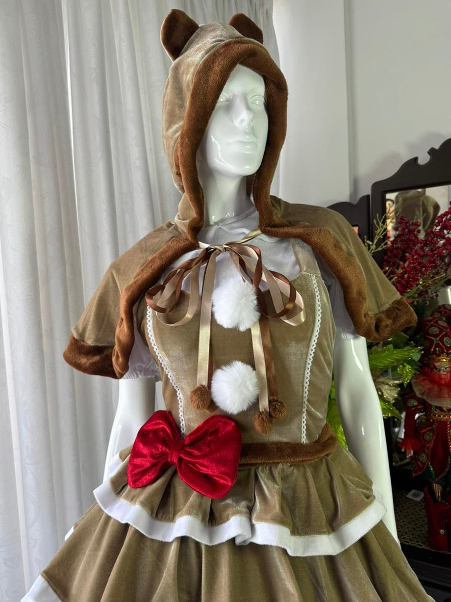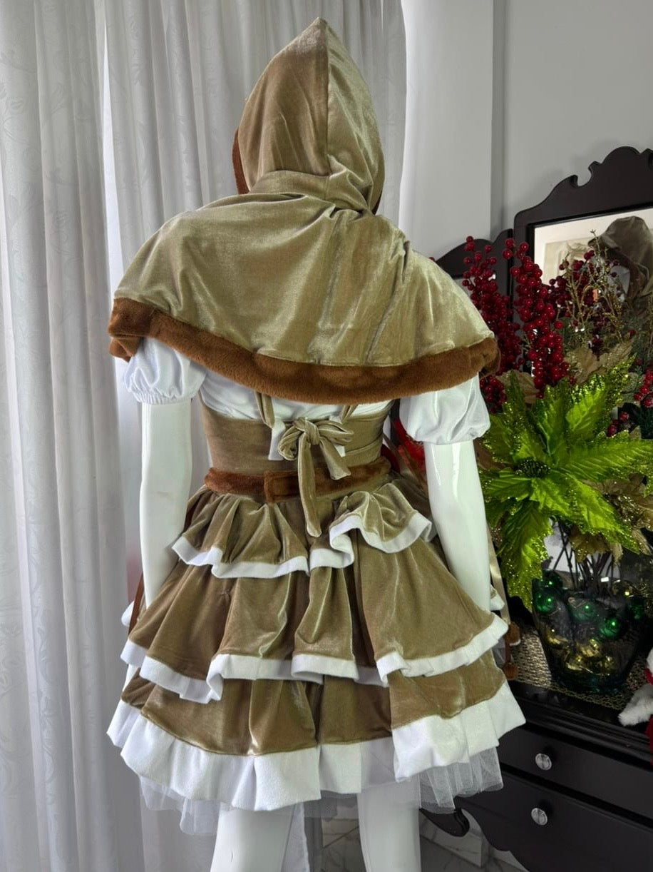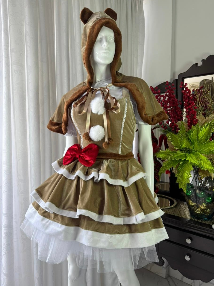 Este look completo incluye una capa con orejitas, blusa suave, vestido con acabados aterciopelados, tutú de tul con volumen y panty a juego. Cada pieza está diseñada con detalles cuidados: cintas satinadas, pompones, vuelos en capas y un elegante moño rojo que resalta la silueta.
