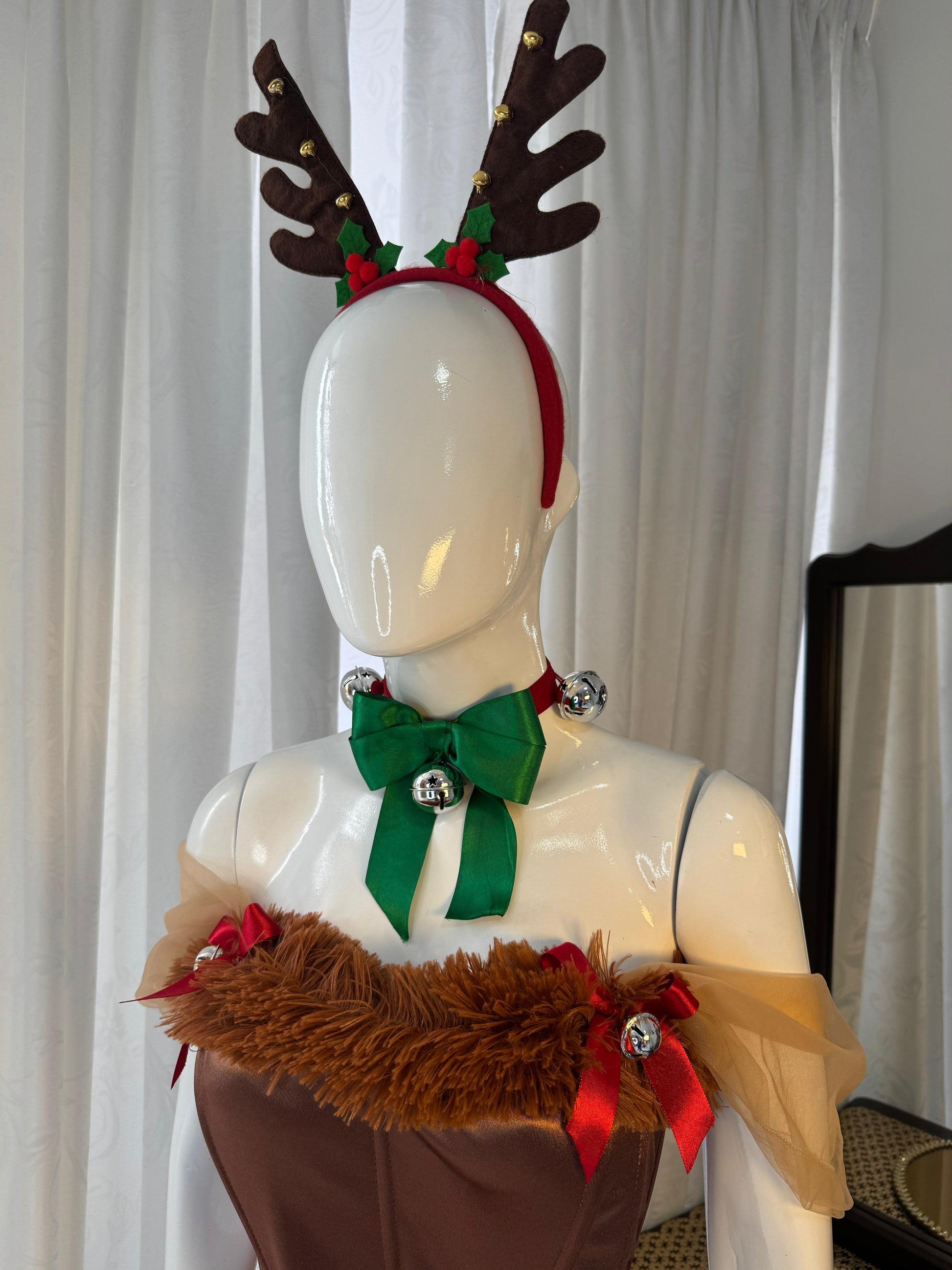 Inspírate en la ternura y elegancia del clásico reno navideño con este conjunto irresistible. Incluye diadema con astas, corbata decorativa, corset que realza la figura, short ajustado y ligas a juego. Una mezcla perfecta entre sensualidad y dulzura que te hará destacar en cualquier celebración o sesión festiva.